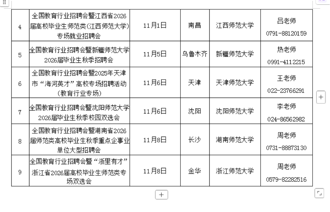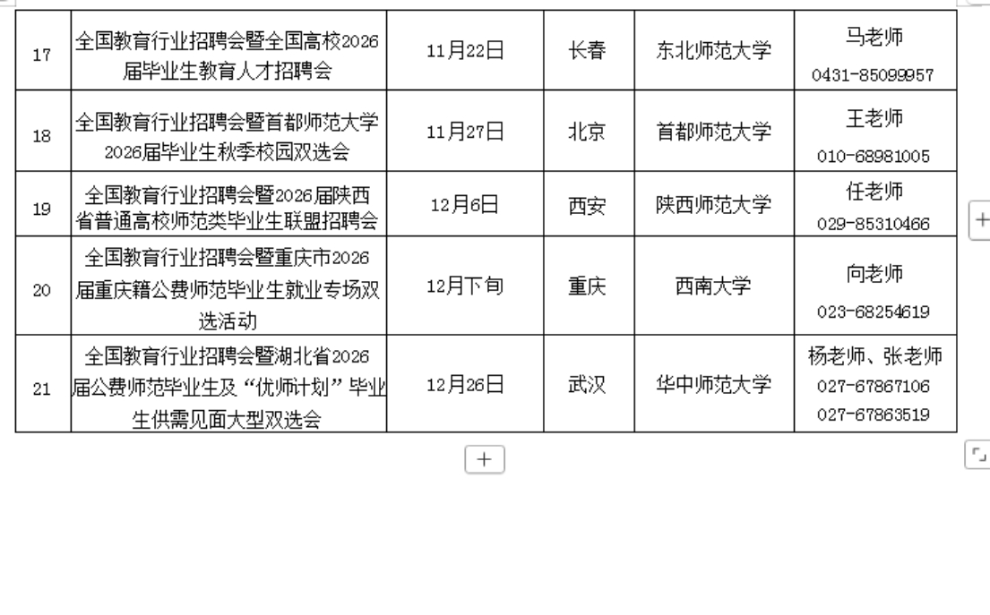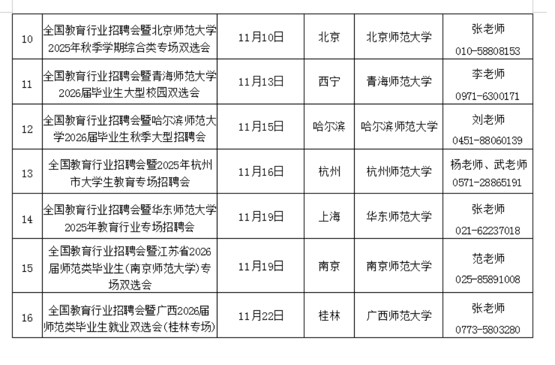 (二)举办线下校园招聘活动。10月25日至12月26 日,在太原、石家庄、广州、南昌、乌鲁木齐等城市举办教育行业系列专场招聘活动。其中,11月22日在长春举办“全 国高校2026届毕业生教育人才招聘会”,设立国优计划招聘专区、优师计划招聘专区、实习生招聘专区,开展校企供需对接活动,汇聚全国教育系统优质资源,为高校毕业生提供优质岗位,为教育行业用人单位招才引智搭建平台。