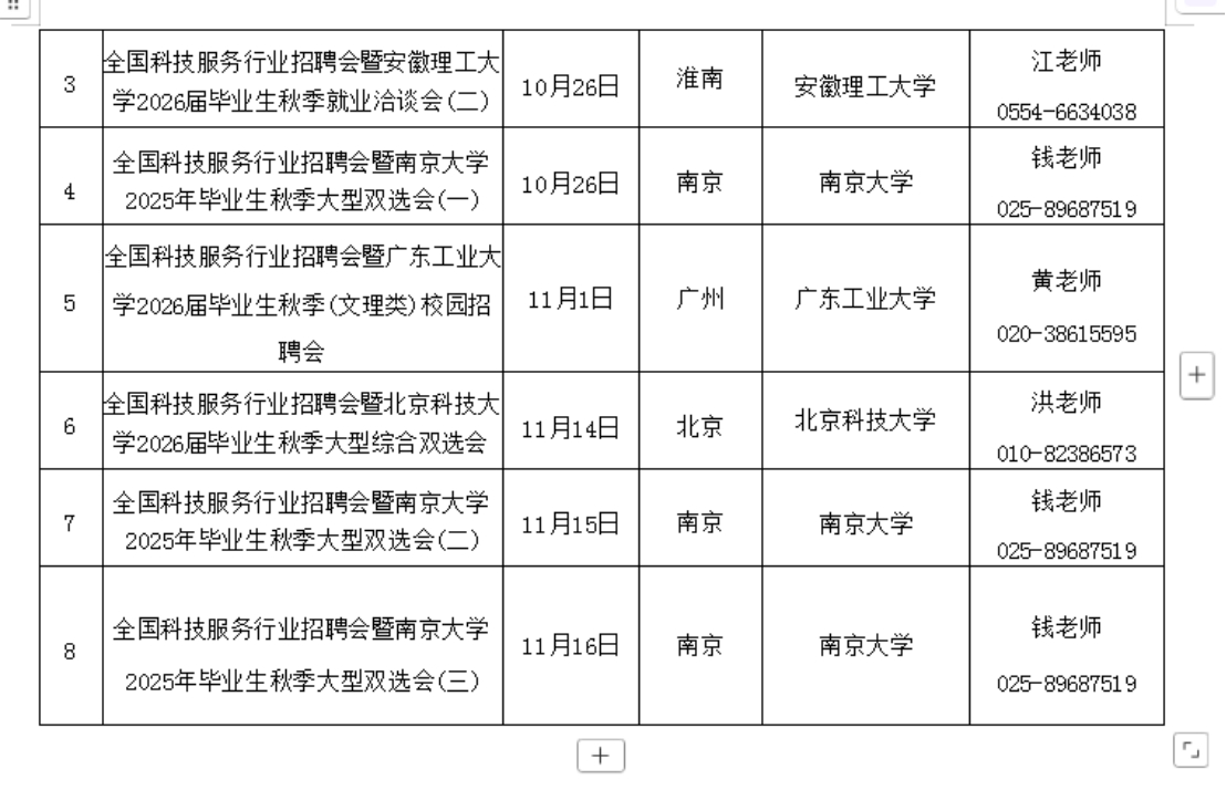 (二)举办线下校园招聘活动。10月25日至12月29日,在北京、南京、广州、淮南等城市举办科技服务行业系列专场招聘活动,汇集科技服务行业用人单位优质岗位资源, 助力行业人才和企业精准对接。