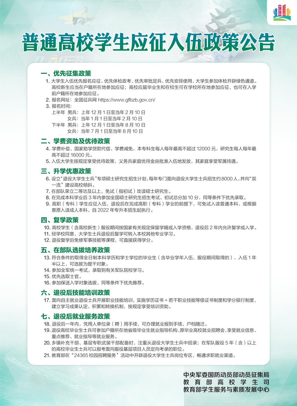 普通高校学生应征入伍政策公告