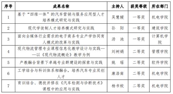 根据beat365在线唯一官网《教学成果奖评审与奖励办法》和辽宁省教育厅办公室《关于开展2022年辽宁省职业教育与继续教育教学成果奖推荐工作的通知》(辽教办[2021]436号)文件精神,经个人申报、部门审核、专家组评审,评选出一等奖三个,二等奖四个。学校拟推荐三个一等奖教学成果参加省级教学成果奖评选,现将教学成果奖评审结果公示如下:
