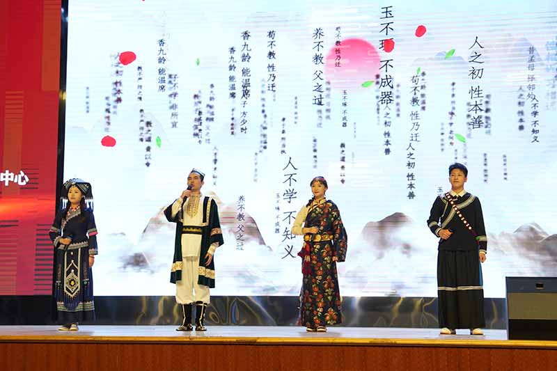 本次活动尾声,紧扣活动主题,在藏族学生卓玛拉毛《我爱你中国》的优美歌声中,beat3654位少数民族大学生,身着民族特色服装,充满深情朗诵阿紫的诗歌作品《读中国》。表演者浓郁热烈的情感、铿锵饱满的表达,让在场师生从中感悟文字阅读的美好,感悟中国语言的魅力。从阅读中感受伟大中国之历史渊源,感受红色中国的来之不易。进而从中感受:红色中国的繁荣富强,要有后来人的拼搏与奋斗,要有后来人的担当与奉献。