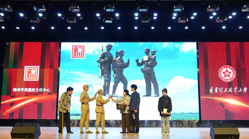 穿越情景剧《跨越时空的锦州苹果》非常新颖,当我看见解放军叔叔再渴再累,甚至嘴唇都干裂也不吃一个苹果,既让我深刻理解锦州苹果廉洁文化,更让我深深爱上了这座英雄城市。—护理学院高玉珊如是说。