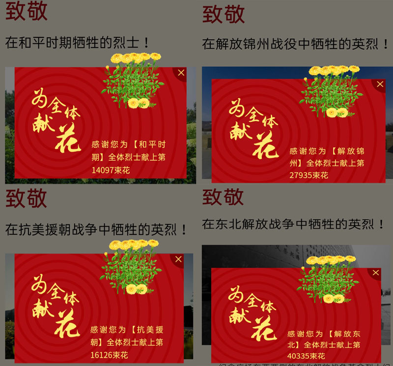 我院在校生468人,因疫情未返校学生60人,共528名学生全员参与,通过辽沈战役纪念馆平台的网上祭扫入口,对解放东北、解放锦州、抗美援朝、和平时期的英烈们通过鲜花的方式表达对先辈们的敬意和思念。除此之外,学生们还通过平台进行“线上展览” “全景导览” “语音讲解”和“红色故事”几个栏目的学习。