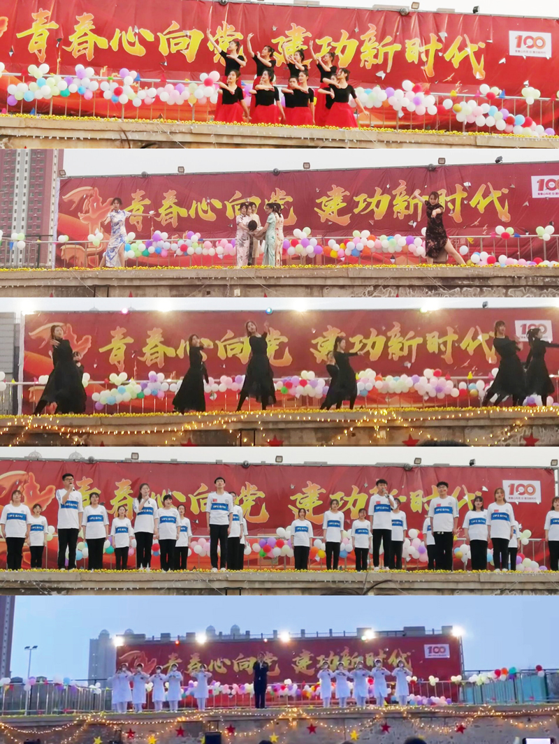 孟庆男校长一段温暖而又振奋人心的讲话拉开了晚会的帷幕。孟校长对前一阶段封校期间师生们的付出、努力给予了充分的肯定,并对全体教职工和同学们给予了新的希望和祝福。接下来举行了出团旗、唱团歌仪式。在护理学院学生会的诗朗诵《百年团魂、强国有我》中,学生教官托举团旗缓缓入场,在管理学院学生的领唱下全场同学齐唱团歌。随后,学生处长张丽娜带领南校区全体辅导员老师表演了动感十足的热身舞蹈,把晚会推向一个小高潮。管理学院的同学们献上了舞蹈《灯火里的中国》、《万疆》、《别叫我达芬奇》、歌伴舞《你就是晴天》、抗日舞蹈剧、歌曲串烧,婀娜的舞姿、动听的歌声给大家带来美的享受,赢得了同学们的阵阵掌声。护理学院的同学们带来了男生二重唱《孤勇者》、爵士舞《Good Time》、小合唱《强国一代有我在》、歌伴舞《听我说谢谢你》。老师们的演出更让同学们眼前一亮,总务处副处长赵振鹏老师一首耳熟能详的《你》,保卫处梁峰、孙宏运老师的《军中绿花》以及宿管阿姨们的广场舞《酒醉的蝴蝶》赢得了全场观众的呐喊声和喝彩声。