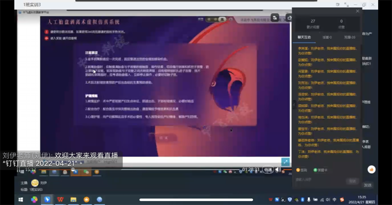 学生通过电脑终端,或通过手机接收教师在钉钉课堂的分享,通过教师主讲,实景实验视频演示及虚拟实验操作,多维度生动逼真地进行着心电监护仪教学训练、血糖仪教学训练、鼻导管吸氧教学训练等实训课程。虚拟仿真实训系统对护理情景和病例的模拟,生动具体,理实结合,很容易被学生理解接受。