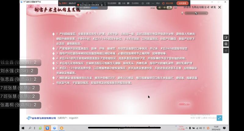 护理学院车龙浩院长会同实训中心主任鄂海玲副教授,根据当下实验实训相关课程教学急需,与山东中飞科技紧急协商并得到公司的免费支援,筛选出7个相关教学实训模块,相关教师进行培训试用后投入教学使用。使2020级、2021级护理专业开设的基础护理、内外妇儿等临床护理、康复护理等课程的线上实训教学全部得到有序高效地运行。