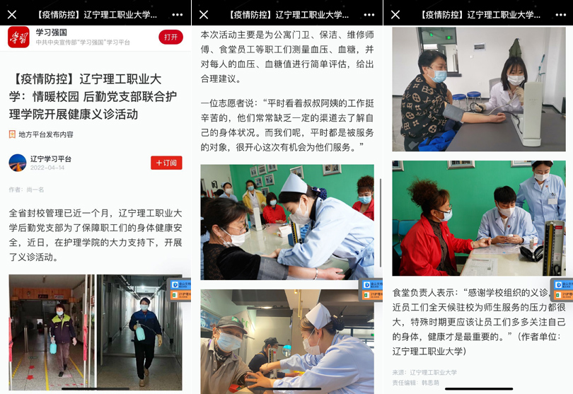 近日,为保障职工们的身体健康,后勤党支部联合护理学院开展了义诊活动。为公寓门卫、保洁、维修师傅、食堂员工测量血压、血糖,进行初步的健康评估。这是一次爱的互动,是一次温暖的行动,此次义诊活动于4月14日被“学习强国”平台报道。