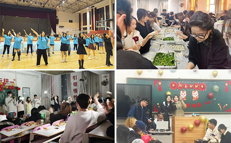 活动中,有的班级集体组织包饺子活动,同学们在欢声笑语中共同感受包饺子的快乐,每个人的家乡记忆里,都少不了饺子的存在,那些对家人、朋友不善言辞的思念,都在饺子面前漏了馅儿。有的班级组织了丰富多彩的游戏、娱乐活动,同学们热情四溢、载歌载舞,传递着美好的情感与祝福。