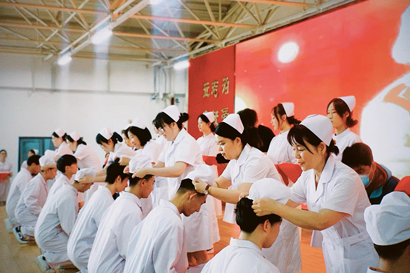大会第三项,庄严而神圣的授帽仪式开始了。伴随着神圣的音乐,182名身着白色护士服的学生走向舞台,逐一接受神圣而庄严的授帽礼。护理前辈们亲手为护理学子带上圣洁的燕帽。此刻起,她们就要开始承担守护生命的重任,时刻与生命同行!最后,在刘沫院长的带领下,同学们集体宣誓,增强了同学们的使命感,以更加昂扬的姿态进入实习和工作岗位。
