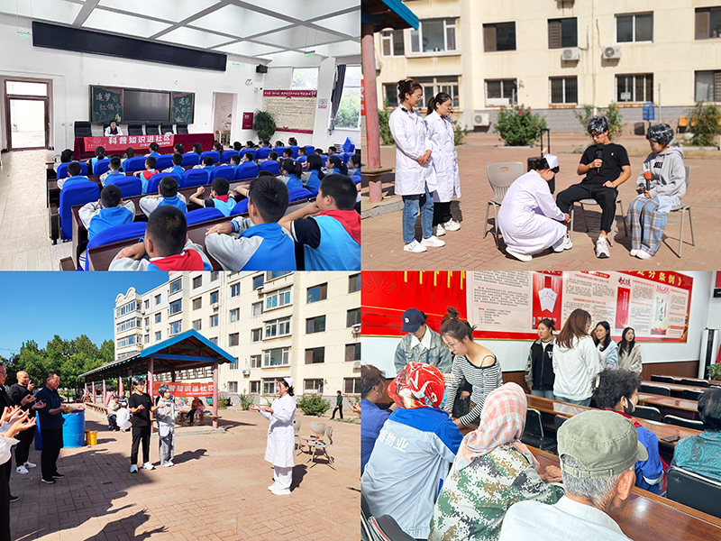 9月18日在白台子村,志愿者耐心的为到场的老年人们测量血压并解答问题,结合文字、图片,用贴近生活的实例,从泌尿系统的基本结构、女性生殖系统结构等方面,进行了急性尿失禁、宫颈及乳房相关疾病的详细讲解,引导广大老年女性群体积极关注自身健康,树立健康意识。9月20日在滨海新区实验小学,张会君副院长做了“阳光,长个需要你”的讲座,并通过互动问答等形式将爱眼、护齿和骨骼健康的知识传给了每一位参与的小学生,显著提高了他们的健康意识和自我保护能力。由学生表演的“明亮的世界从我做起”等三幕情景剧,以独特的创意和生动的表演吸引学生的注意力,300多名学生参加并和专业教师现场互动。9月23日在西海口社区,学生志愿者的歌曲表演调动了广大居民的积极参与,老师和学生以情景剧的形式为居民朋友们介绍老年人高血压、低血糖、脑卒中的护理措施及健康宣教,并将海姆立克急救法和扣背排痰技术融入到情景剧中,社区居民积极参与演出,热情度很高,进一步提高了居民的急救意识与能力。