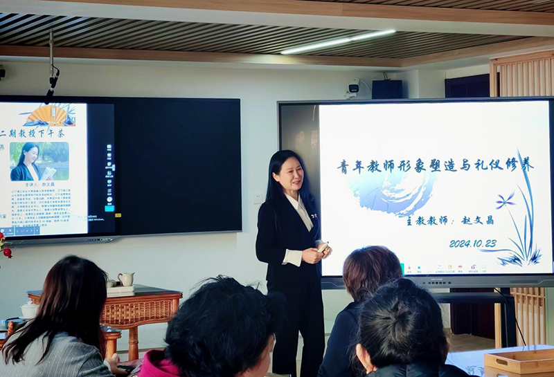 老师如茶,茶释其味,师释其身。在阵阵茶香中,开启本期“下午茶”活动。首先,赵文晶教授从“个人形象六要素”,结合40年教学经验与教师们交流如何塑造教师形象与礼仪修养;其次,结合教师的职业,讲述职场交往六不谈、私人问题五不问、职场男性着装要求以及职场女性化妆要求;最后,通过“沟通与共情”、“说话与善良”、“感恩与心态”、“尊重与距离”四个话题解说礼仪修养。赵教授用慷慨激昂、幽默风趣的语言让大家更加形象生动地了解外在的礼仪与内在的修养。