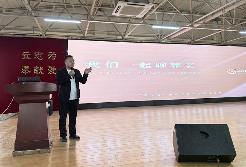 随后,辽宁福禄健康产业集团董事长助理、福禄医养院院长白晓带来题为“我们一起聊养老”专题讲座。作为全国智慧健康养老产教融合共同体理事、辽宁省老年服务协会理事,白院长深耕养老行业多年,他系统解读了养老机构服务标准化建设的必要性,并通过一段《传统汉字里的“老”你懂吗?》视频,深入阐释“老”字中“上老下子”的文化深意——既是孝道传承,更是代际责任。他结合国内老龄化发展现状,剖析“421”“423”家庭结构下的养老困境,解读“银发经济”在医疗康复、智能照护、心理支持等领域的巨大潜力。他特别强调,在政策大力扶持下,传统养老院正向“医养结合”模式转型升级,实现医疗、护理、康复、心理、社工等方面一体化服务。他还分享了医养院中的暖心实践:养老护理员为癌症晚期老人手绘“记忆相册”,为卧床老人弹奏老歌缓解焦虑……这些细节让同学们深刻体会到,“有温度的养老”不是口号,而是藏在每一个用心设计的服务环节中。