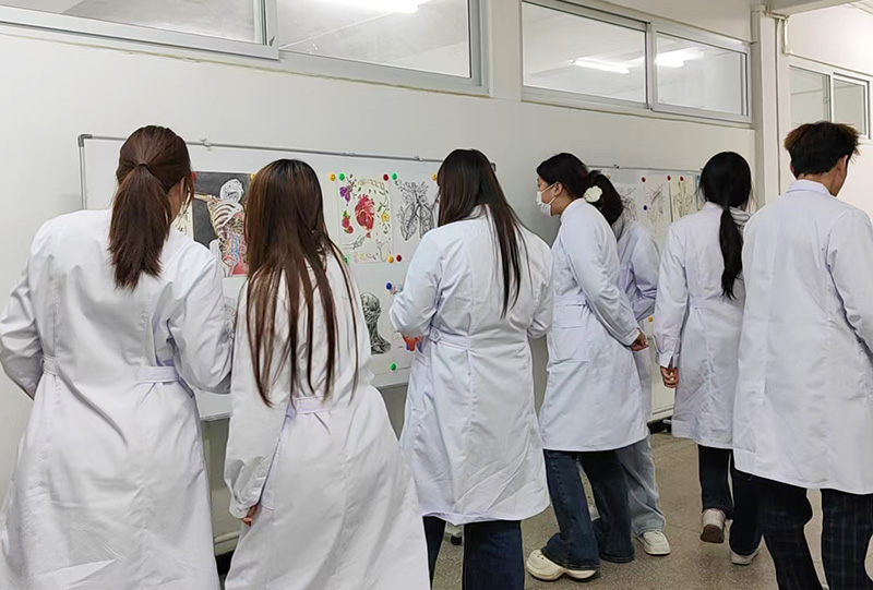 赛后,获奖作品在护理技能实训中心三楼开展为期一周的现场展示,精美的绘图作品吸引了大量师生驻足观摩、交流探讨。同学们在欣赏优秀作品的过程中,相互学习解剖知识的精准表达与绘图技巧的创新应用,形成了“观摩学习、交流互鉴”的良好氛围,实现了优秀成果的共享传播。