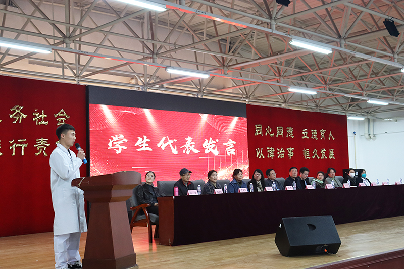 会议共分为五项内容:首先,大会的第一项内容,由护理党支部副书记李晓燕,宣读表彰在学校评奖评优中获奖的先进集体和优秀个人、表彰在上学期期末考试中专业排名前二十的“学习标兵”决定。大会第二项内容,表彰疫情防控突出贡献奖。大会第三项内容,由获奖个人代表2022级护理2班的周敏同学、2021级护理4班的王梓旭同学分别进行学习经验交流和分享。大会第四项内容,由护理学院青年教师代表赵佳琪老师发言。 大会第五项内容,领导讲话。首先,时力华校长讲话。时校长对同学们的精神面貌、护理学院所取得的成绩、以及疫情期间同学们所做的贡献给予了充分肯定。同时,希望同学们能够刻苦努力学习,练就过硬本领,以拼搏奋斗的姿态来面对自己的大学生活,也预祝同学们取得更大的成绩和进步。接下来,护理学院院长车龙浩讲话,车院长在向获得表彰的同学给予充分肯定的同时,用护理学院“崇德仁爱、笃学精技”寄语全院学子要崇尚医德、心怀仁爱、专心好学、精进技能。要用辛勤的汗水践行奋斗的青春,用严谨认真的态度诠释拼搏的价值。