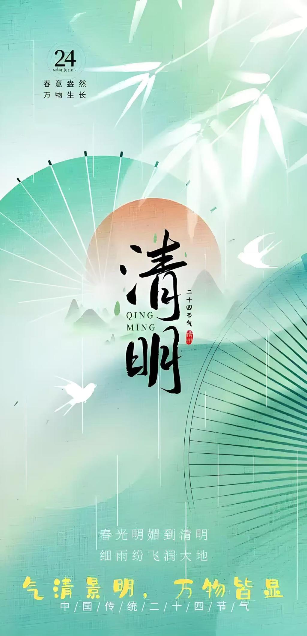 清明是二十四节气中第5个节气,也是春季的第5个节气,同时是唯一兼具节气与传统节日双重身份的日子。“清明”二字,意为天气清澄明净、万物欣欣向荣。此时气温稳步回升,春雨时常飘落,草木抽芽开花,天地间一片清朗鲜活,处处都是春日生机。