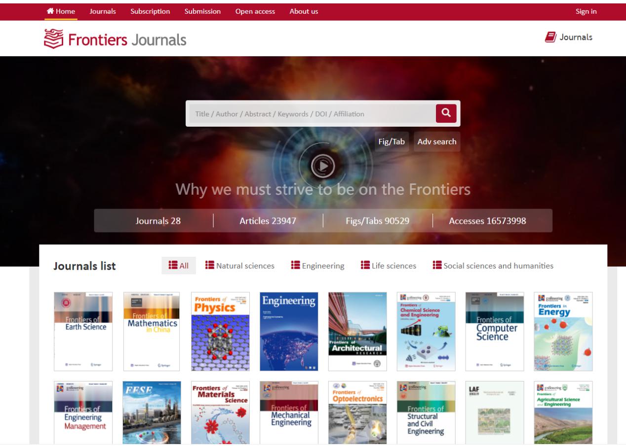 Frontiers《前沿》系列期刊是由教育部主管、高等教育出版社出版的大型英文学术期刊,旨在集中高校科研优势,凝聚国内科研力量,打造中国自主品牌的国际化学术交流平台和期刊内容传播平台。Frontiers《前沿》系列期刊于2006年创刊,目前共出版28种期刊,涵盖基础科学、工程技术、生命科学、人文社会科学等领域。系列期刊定位于各研究领域的最新学术成果和发展动向,及时反映重大科研成果。在出版方式上采用单篇在线优先出版,保证文章以最快速度发表。读者可通过“中国学术前沿期刊网”免费访问期刊全文,网址为https://journal.hep.com.cn