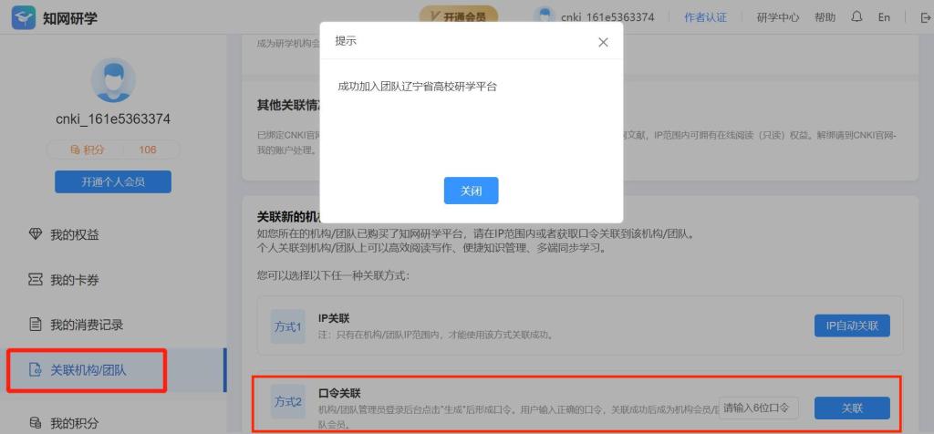 登录研学平台后,点击个人头像进入个人中心,选择“关联机构/团队”,在“口令关联”一栏,输入关联口令“2XLH3N”,关联成功显示“成功加入辽宁省高校研学平台”。