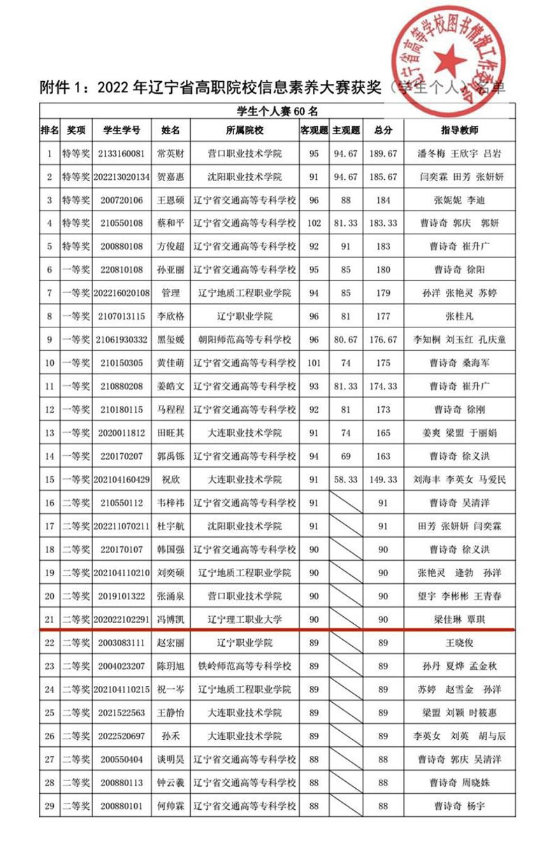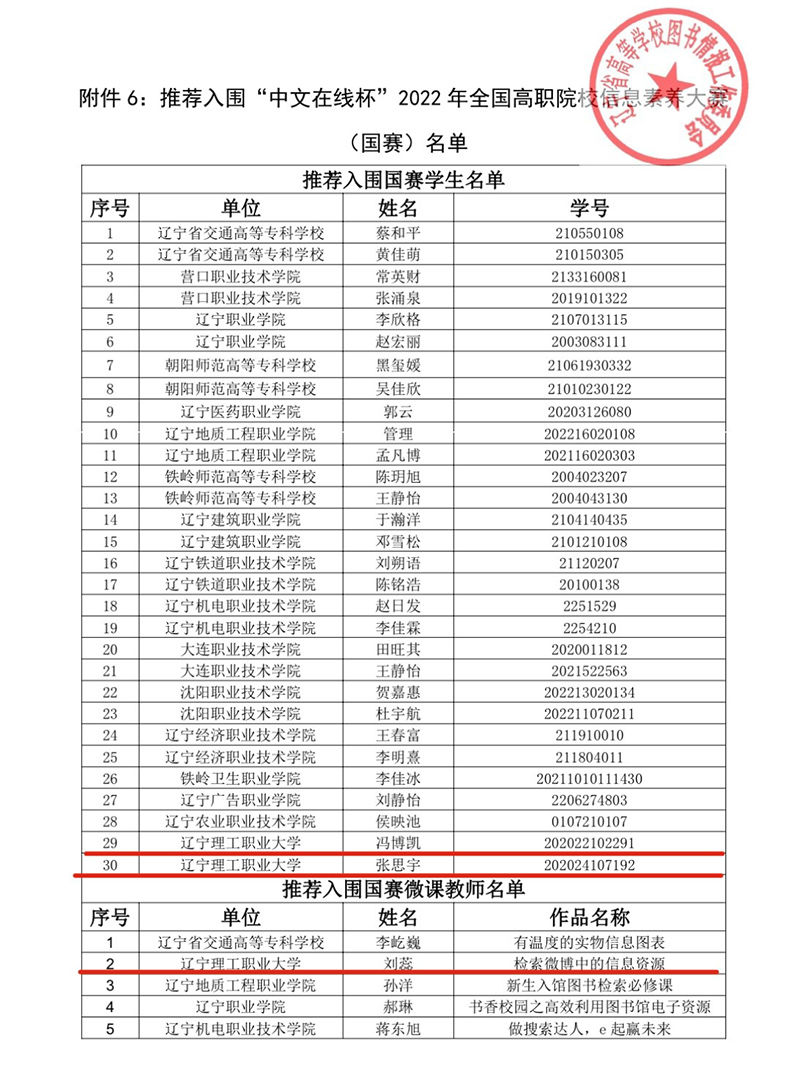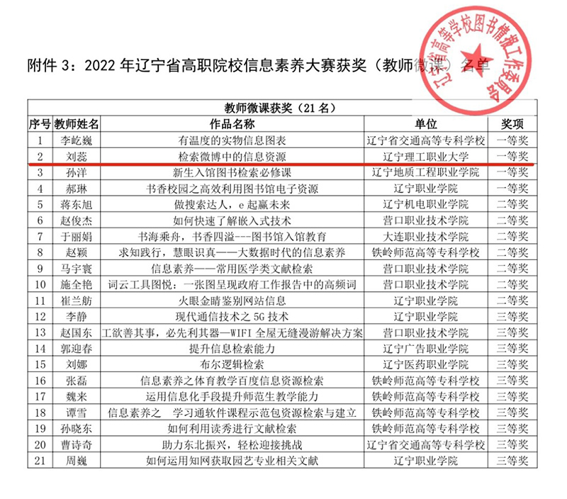 2022年辽宁省“中文在线杯”高职院校信息素养大赛,在全省各高职院校的支持与努力下圆满落下帷幕。自9月1日赛事启动以来得到全省各高校图书馆积极响应,共有4444名学生参加省赛,37名教师参加教师微课賽。由于疫情影响,今年仍然采用线上考场形式,经过激烈的云端角逐,全省学生个人赛60名获奖、优秀指导教师73名、教师微课賽获奖作品21个、先进工作者10名。本次大赛进一步激发了大学生学习信息素养知识与技能的热情,增强了图书馆资源与服务的推广力度,提升了大学生信息素养能力。