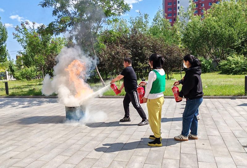 在图书馆内,两位老师带领馆员边走边讲,直观展示了消火栓、消防应急灯、烟感报警器等消防应急相关物品,将理论知识与图书馆实际情况一一对应,为馆员们答疑解惑,使全体成员对消防应急物品的使用方法有了明晰的认知。最后,两位老师在图书馆门前指导馆员进行灭火演练。每四人为一组,每人手持干粉灭火器,按照“提、拔、握、压”四个步骤科学操作。