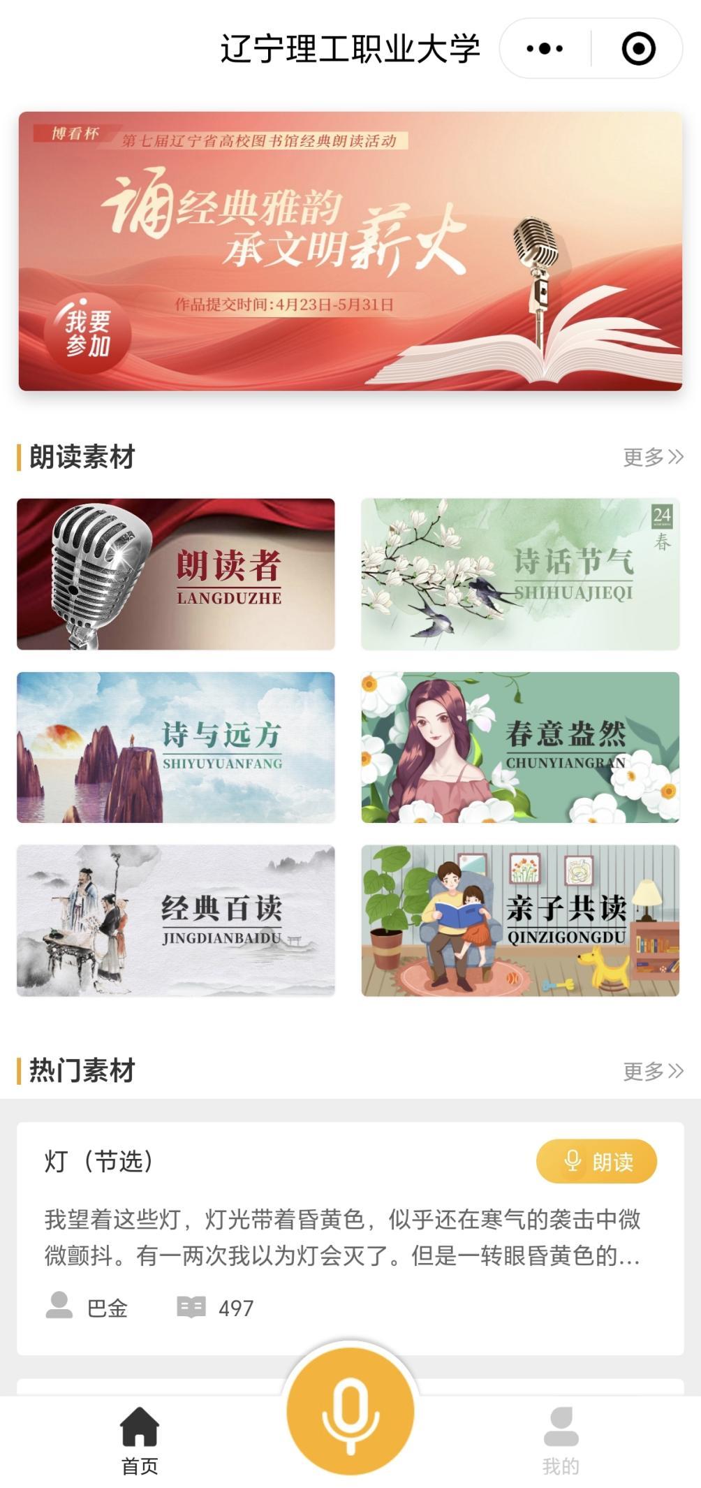 2.请选择小程序“诵经典雅韵承文明薪火”专区素材进行朗读,或自备符合主题的朗读素材。