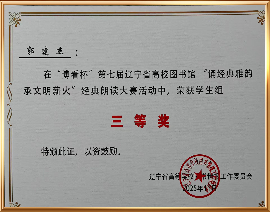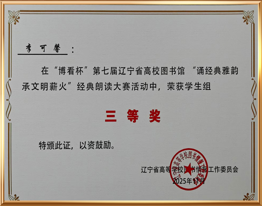 “博看杯”第七届辽宁省高校图书馆“诵经典雅韵 承文明薪火”经典朗读活动中荣获三等奖 |
