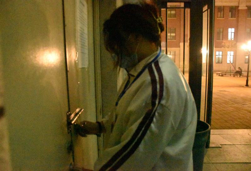 作为一名学生志愿者,她严格落实学校疫情防控工作各项要求,认真巡查各处学生志愿者值班岗点,看见密集人群,积极劝导人群分散,同时不忘宣传学校防疫要求,防疫规定。每每在校园各处都能看见她忙碌的身影。尽管每天往返各个志愿服务岗,动辄横跨整个校园,但她总是在第一时间打开球馆(羽毛球、乒乓球)大门;每天晚上坚守到球馆最后一个人离开,锁好门窗。