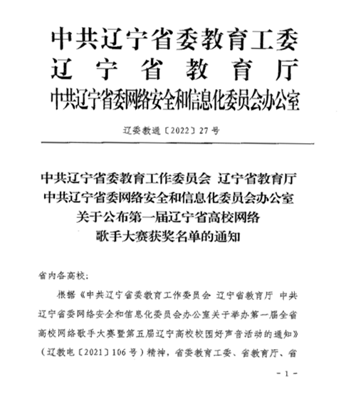根据《中共辽宁省委教育工作委员会辽宁省教育厅中共辽宁省委网络安全和信息化委员会办公室关于举办第一届全省高校网络歌手大赛暨第五届辽宁高校校园好声音活动的通知》(辽教电[2021]106号)精神,校团委积极组织学生参与,在“云端”一展歌喉,展现青春风采、勇担强国使命、唱响时代华章。最终,beat3652021级建筑工程学院学生苑毅荣获第一届辽宁省高校网络歌手大赛二等奖。