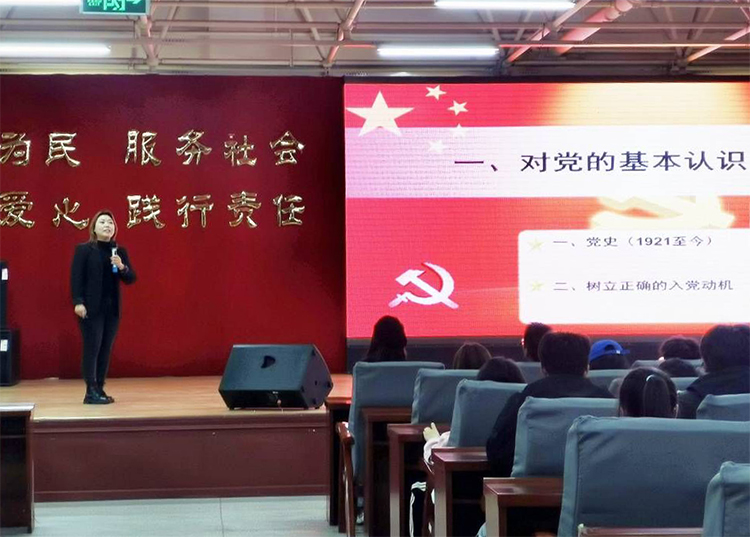 高笑颜老师对中国共产党基本情况及性质宗旨做出全面阐释,并通过视频片段及文字材料串联起中国共产党建党百年的辉煌历史。她要求同学们要自觉学习党的基本知识,端正入党动机,积极向党组织靠拢。并讲解了入党申请书的书写规范及大学生入党的流程。
