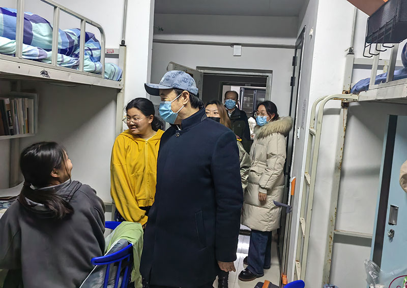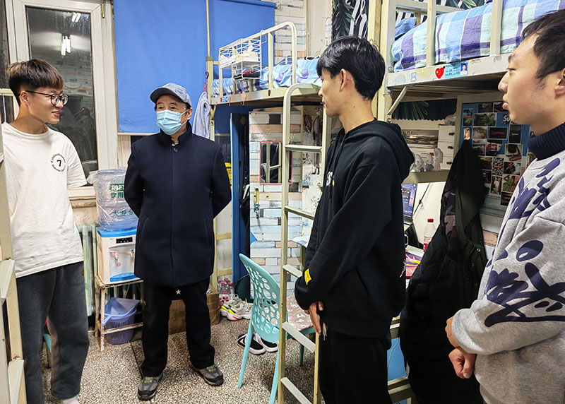 为进一步深化学校疫情防控管理工作,2022年11月28日晚,副校长孟庆男带领南校区四个学院领导、辅导员,对南校区公寓各寝室进行走访,深入了解当前封校期间学生的思想、生活状况。