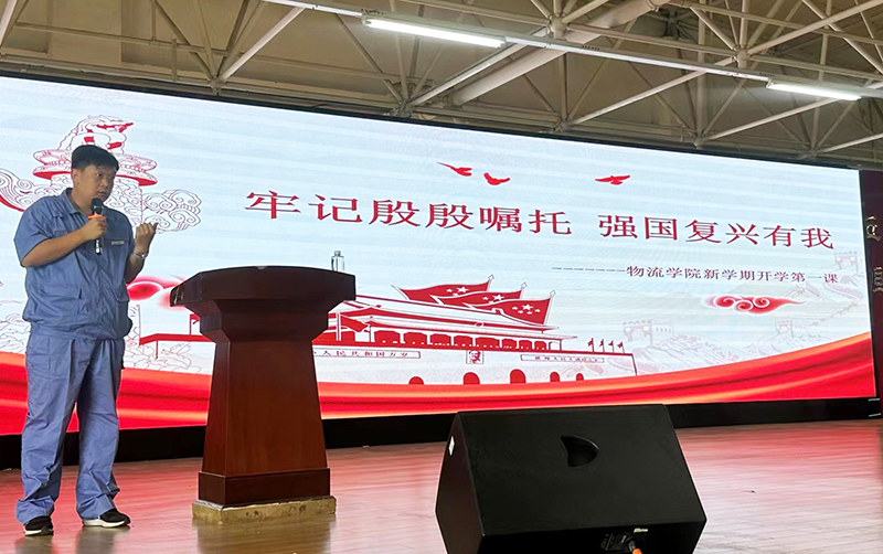 为了更好的贯彻落实党的二十大精神,深入开展学习贯彻习近平新时代中国特色社会主义思想主题教育,全面贯彻党的教育方针,落实立德树人根本任务,教育引导广大学生把个人理想追求融入国家和民族的事业中,树立远大志向、培育美好心灵,培养担当民族复兴大任的时代新人,以不负时代、不负韶华的奋进姿态开启2023年秋季学期新征程。物流学院邀请了“辽宁省劳动模范”、“辽宁青年五四奖章”、“锦州市劳动模范”、“锦州市优秀青年岗位能手”、“锦州市五一劳动奖章”获得者、锦州港杂货码头公司经理,也是物流学院德育导师的丁成涛经理,于8月30日下午14:00在南校区图书馆报告厅为全体物流学院在校生上了一堂生动的开学第一课。
