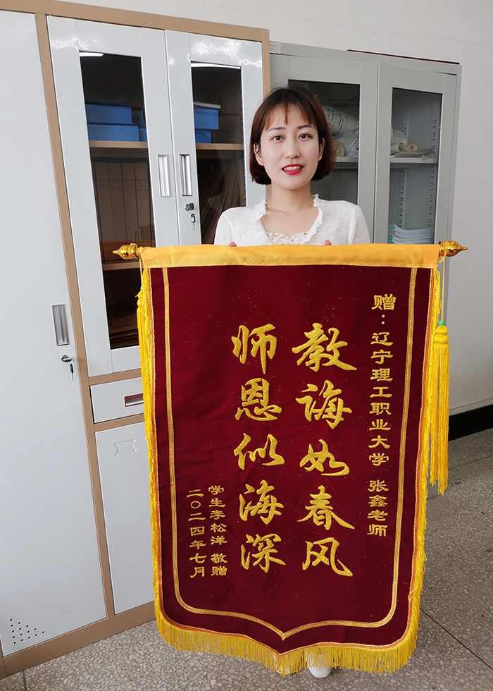 锦旗上,“教诲如春风,师恩似海深”的金色大字熠熠生辉,每一笔都蕴含着李同学对张老师的深深敬意。李同学动情地回忆道:“在准备毕业论文的过程中,我曾一度陷入迷茫和焦虑。是张鑫老师,一直默默付出,从未缺席,在我最无助的时候给予了我最坚定的支持。她不仅耐心地帮我梳理研究思路,还亲自陪我查阅文献,逐字逐句地修改论文。由于我实习单位还有工作需要完成,所以只能利用晚上时间进行论文的修改,张鑫老师为了让我能顺利完成论文,牺牲自己的休息时间,每次都陪我修改到深夜,很感谢张鑫老师的陪伴和付出。因此,在拿到毕业后的第一笔奖金,想送给张鑫老师一件深刻且有意义的礼物。”
