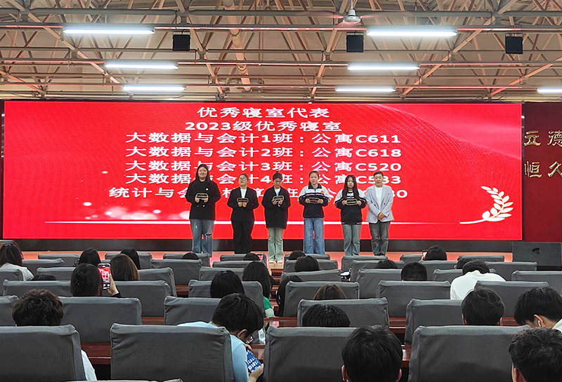 副院长李敏宣读《关于表彰2023-2024学年度学院优秀学风寝室的决定》,对在过去一学年中学习风气好,学习效果优的寝室进行表彰。2022级优秀学风寝室获得者:C623,C631,C632,C633,2023级优秀学风寝室获奖的有大数据与会计1班:C611,大数据与会计2班:C618,大数据与会计3班:C520,大数据与会计4班:C533,统计与会计核算1班C530。在欢快的音乐声中,获奖宿舍代表分批上台领奖。副院长李敏对受表彰的宿舍表示祝贺,她希望同学们要努力奋进、勇攀高峰;要怀抱梦想,脚踏实地;要敢想敢为,善作善成。