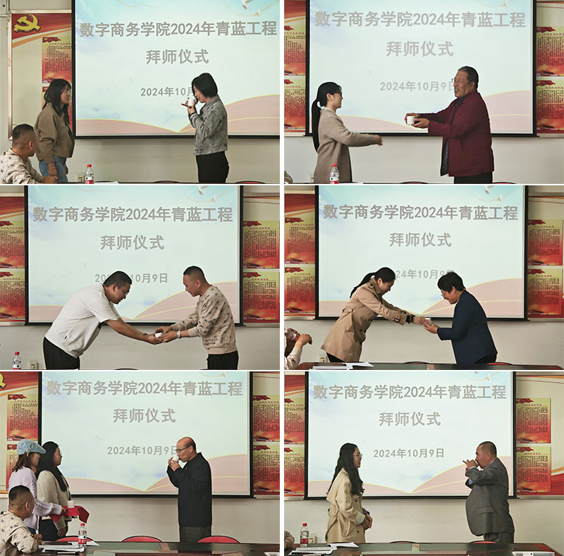 10月9日,数字商务学院2024年“青蓝工程”拜师仪式圆满举行,10对师徒将携手并肩,共同成长。会议由副院长张悦主持,学院领导、教研室主任和青蓝工程结对子教师参加了会议。此次活动旨在更好地发挥老教师、骨干教师、优秀教师传、帮、带作用,促进青年教师快速成长,建设一支高质量的师资队伍。