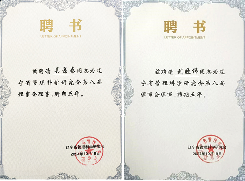 此次会议审议第七届理事会工作报告并选举产生第八届理事会,我院吴景泰教授、刘晓伟教授当选为辽宁省管理科学研究会第八届理事会理事。
