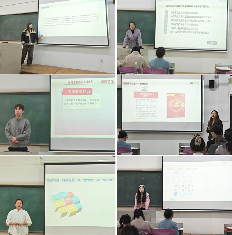 为树立典型,激励更多教师特别是青年教师积极投身于此项工作,学院经过认真遴选,特别推选出六位在国培、省培及企业实践中表现突出的优秀教师代表进行交流。他们结合自身赴企业实践的经历,从行业前沿动态、岗位实操技能、项目运作逻辑等维度展开分享,深入剖析了实践、培训中的核心收获与教学启发,提出将企业真实案例、数据思维与行业标准融入课堂教学的具体思路,为课程改革与人才培养提供了鲜活参考。发言中,教师们“从课堂到企业、再从企业回课堂”的角色转变与思考,引发在场教职工的广泛共鸣。