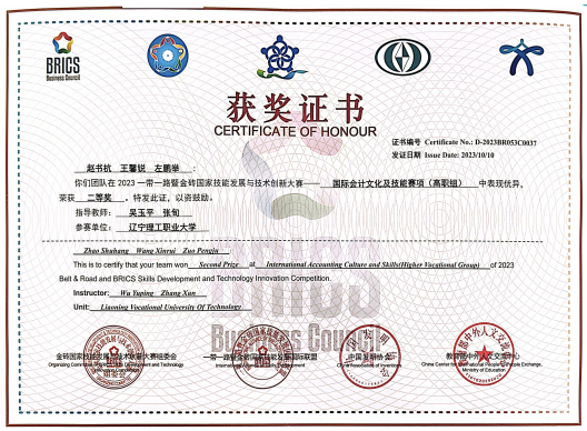 2023一带一路暨金砖国家技能发展与技术创新大赛之国际会计文化及技能赛项国家级二等奖证书