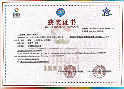 2023一带一路暨金砖国家技能发展与技术创新大赛之国际会计文化及技能赛项省级一等奖证书
