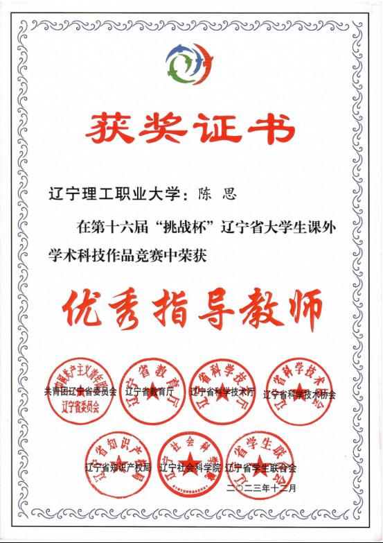 第十六届“挑战杯”辽宁省大学生课外学术科技作品竞赛优秀指导教师证书