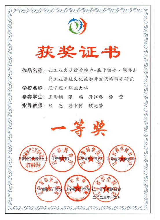 第十六届“挑战杯”辽宁省大学生课外学术科技作品竞赛一等奖证书