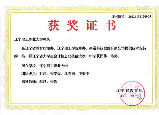 第一届辽宁省大学生会计信息化技能大赛一等奖证书