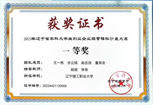 2023年辽宁省本科大学生创业企业经营模拟沙盘大赛一等奖证书