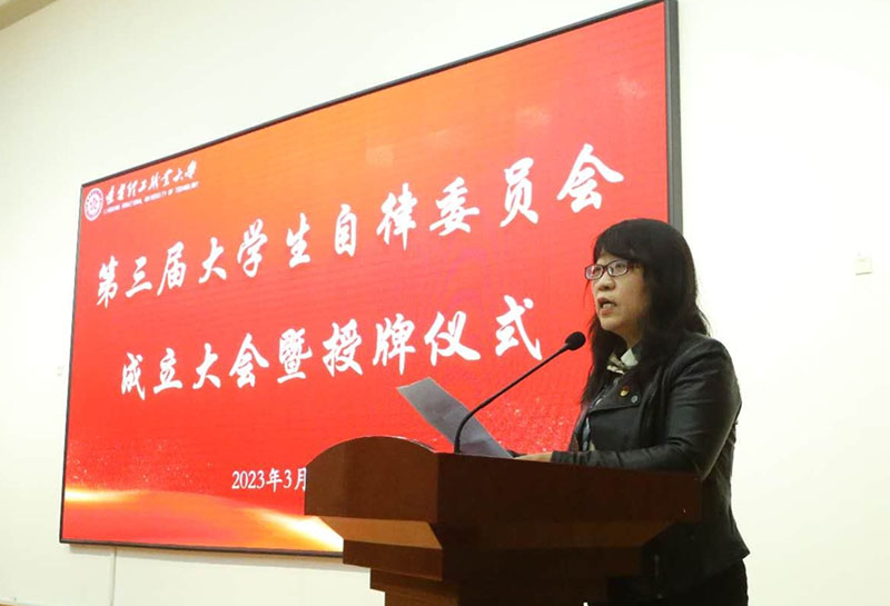 最后学生处处长王萍对第三届大学生自律委员会的成立表示真诚祝贺,对新委员的加入表示热烈欢迎。王处长讲到,过去的一年,大学生自律委员会的全体成员认真履行职责,特别是在疫情防控的非常时期,以踔厉奋发的意志,在beat365打赢疫情防控攻坚战中做出了贡献。希望在新的一年,自律委员会的全体成员以二十大精神为指导,牢记二十大报告中习近平总书记对广大青年的寄语,不断提高政治素质,发挥榜样力量,做好青年同学的榜样;增强服务意识,找准角色定位,做好学生工作的助手;提高协调能力,明确工作方向,做好和谐校园的促进者。