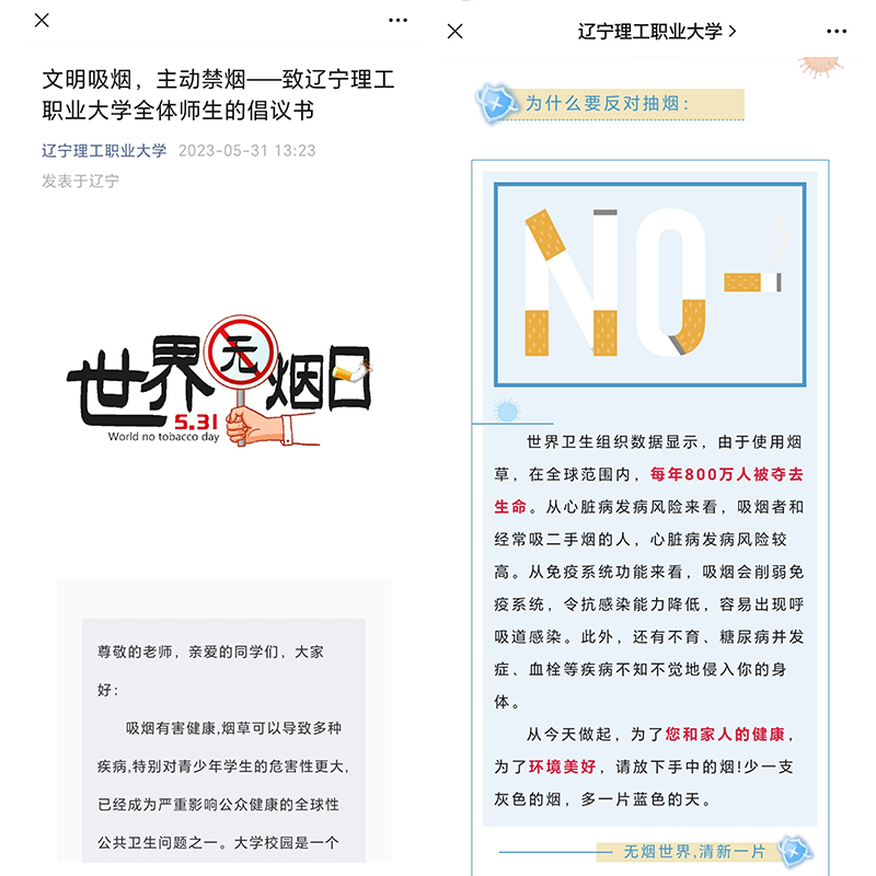 今年5月31日是第36个“世界无烟日”,为倡导热爱环境与生命,引导大学生养成良好的文明行为习惯,促进beat365精神文明建设,构建安全健康、文明和谐的校园环境,以“世界无烟日”为契机,beat365学生处、教务处、学校办公室、后勤服务中心等部门联合开展“文明吸烟 主动禁烟”主题教育活动,并将5月29日-6月4日确定为主题教育活动周。