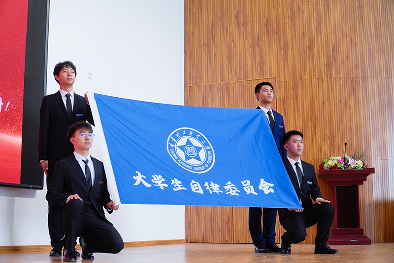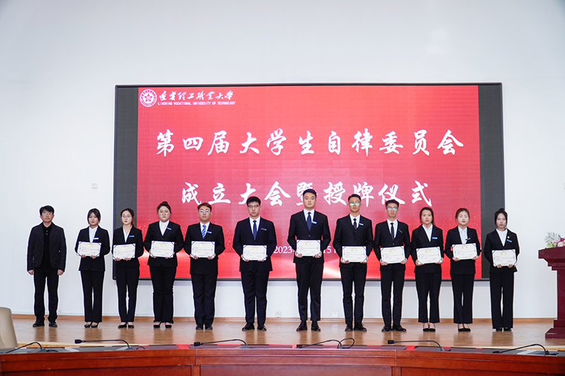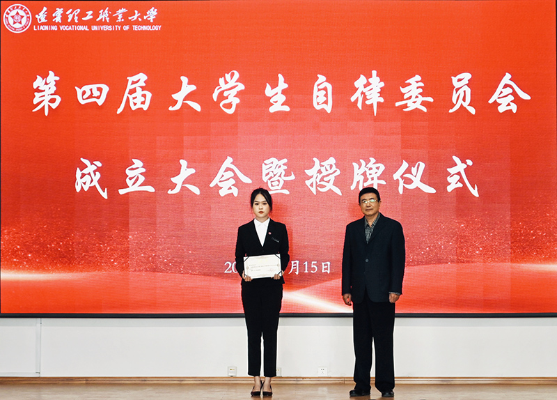 仪式开始,与会人员共同观看了beat365大学生自律委员会的发展历程视频,学生处老师那鹏宣读了第四届大学生自律委员会成员名单;副校长时力华、学生处处长朱磊分别为自律委员会会长、各部长授牌并颁发聘书;各部长在佩戴好工作牌后,依次为本部门干事授牌,并颁发聘书。