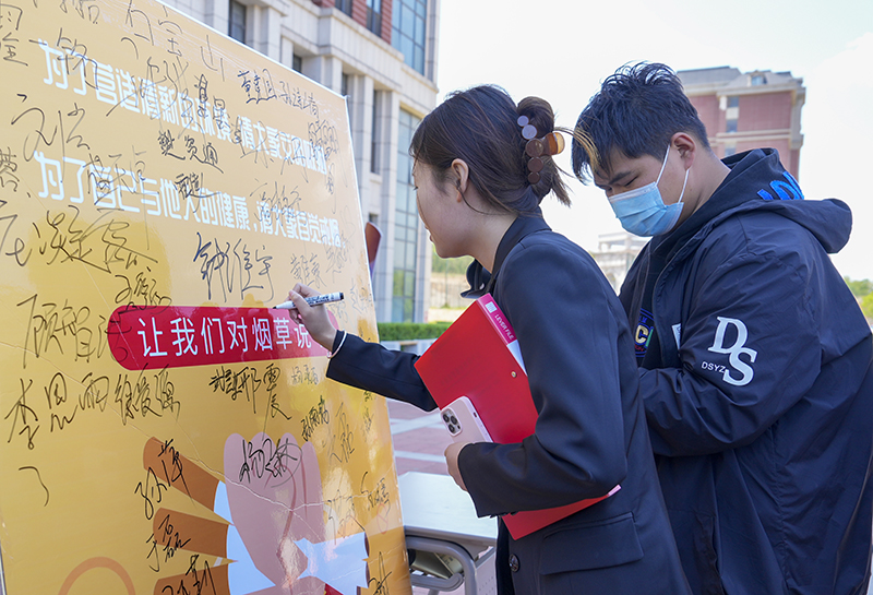 活动伊始,学校举行了隆重的启动仪式。各学院学生代表参加。在仪式上,学生代表通过宣读《禁烟倡议书》向全体师生发出了禁烟的倡议,呼吁大家远离烟草、珍爱生命。“与香烟做个了断”环节,通过折断香烟模型的方式,表达了坚决拒绝“第一支烟”、抵制吸烟、追求健康生活的决心。这一环节不仅形式新颖、寓意深远,更在师生中引起了强烈共鸣,为整个活动周奠定了坚实的基础。最后,组织了师生代表在禁烟宣传板上签字活动。大家纷纷走上前台,郑重地在宣传板上签下自己的名字,承诺将积极参与到禁烟行动中来,共同维护校园环境的清新与健康,增强了师生们的参与感和责任感,也为校园禁烟氛围的营造起到了积极的推动作用。