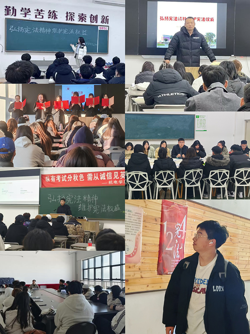 在12月2日-4日期间,各学院以“弘扬宪法精神 维护宪法权威”“大力弘扬宪法精神 推动进一步全面深化改革”为主题,深入开展主题班会、普法宣讲、知识竞赛、辩论比赛、座谈会、制作宣传海报、绘制漫画、制作短视频等多种形式的宪法学习宣传教育活动。重点学习宣传习近平新时代中国特色社会主义思想和党的二十大、党的二十届三中全会精神;深入学习宣传宪法、民法典、教育法律法规以及国旗法、国歌法、国徽法、爱国主义教育法等相关法律知识,学习新中国宪法发展历程和宪法的地位作用、新中国成立75年来特别是党的十八大以来全面依法治国取得的历史性成就等,推动形成尊崇宪法、学习宪法、遵守宪法、维护宪法、运用宪法的良好氛围。