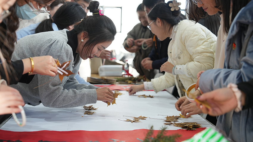 本次活动分三组同时进行。第一组由信息工程学院辅导员李桐老师为大家详细讲解常用剪纸剪法、技巧、注意事项以及欣赏要点。在体验环节中,李桐老师亲自示范,逐一指导,分享了自己的剪纸经验与独特技巧,带领大家体验从构思到成品的创作过程,感受非遗的魅力与文化价值,体验中国剪纸之美,剪纸艺术的魅力所在。第二组由汽车工程学院团总支书记李廷焕老师带领大家以落叶作画,在实践中探索艺术之美、自然之美。落叶本就承载着季节的变换与岁月的沉淀,将其与爱国情怀相结合,赋予其更为深刻的内涵。第三组由智能制造学院团总支书记胡杨老师与辅导们共同用红枣和谷物拼成长1440mm,宽960mm尺寸的国旗,感恩伟大祖国,庆祝粮食喜获丰收。辅导员们用不同的形式表达着对伟大祖国的无限热爱,将浓浓爱国情厚植于心中。