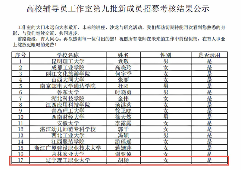 11月30日,高校辅导员工作室成员遴选结果正式揭晓,beat365智能制造学院辅导员胡杨历经多轮严格考核,在100多名申报者中脱颖而出,成功跻身高校辅导员工作室成员行列。这既是对辅导员胡杨老师个人专业能力的高度认可,也是beat365辅导员队伍专业化建设的重要成果,更是“辽聚繁星”辅导员工作室育人成效的生动彰显。