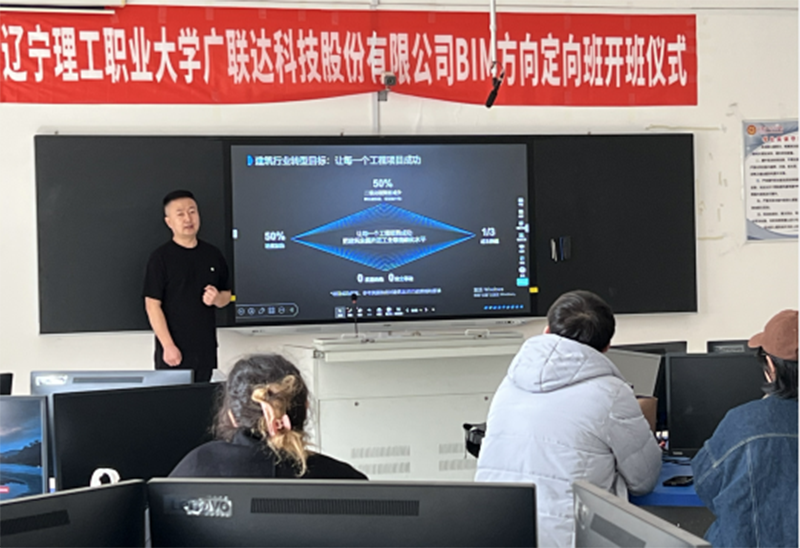 随后,广联达科技股份有限公司张经理从公司简介、数字高校、数字高校业务、产教融合协同育人、BIM定向班的合作内容几个方面为定向班的所有学员进行了详细的介绍。