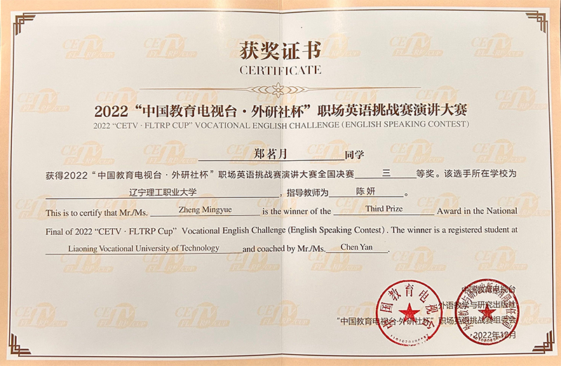 郑茗月同学在2022年11月辽宁省“中国教育电视台外研社杯”职场英语挑战赛中获得一等奖,并最终代表辽宁省于2022年12月参加了国赛。在省赛和国赛期间,郑茗月同学克服了疫情期间备赛、参赛的诸多困难,在时间紧、任务重的情况下勇挑重担,以高度的责任感和使命感,完美地完成了本次参赛任务,并在比赛中脱颖而出,又一次为beat365获得了国赛奖项。
